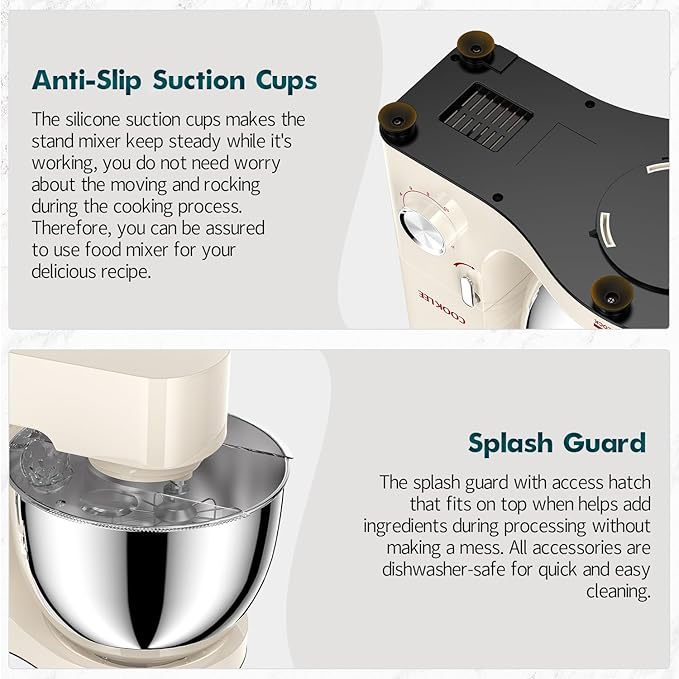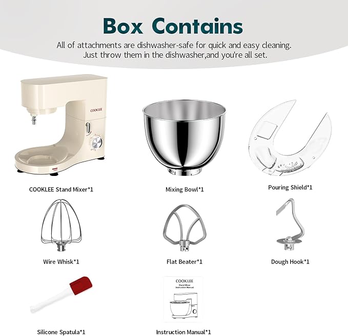 - 9.5-QUART HIGH CAPACITY - Large stainless steel mixing bowl offers enough capacity. Each COOKLEE kitchen Electric mixer comes with a dough hook, flat beater, wire whip, and pouring shield avoiding mess kneading process.