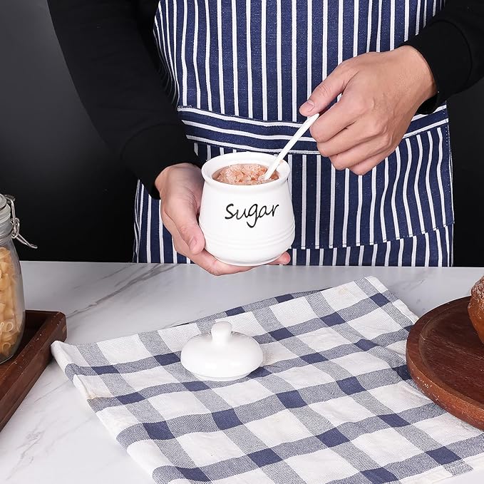 - DESIGN CONCEPT: This sugar bowl is equipped with a lid and a small spoon. The lid can keep your ingredients away from dust. There is a perfect notch on the lid for placing the spoon, so you don’t have to worry about placing the spoon randomly