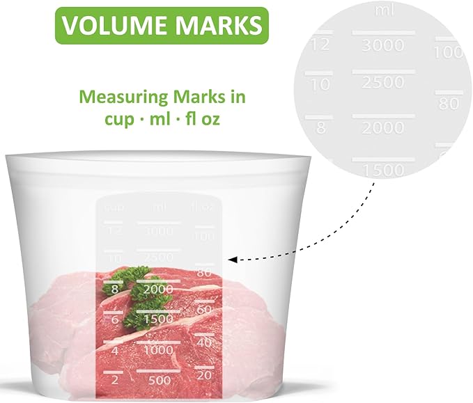 - 【EXTRA LARGE & ECONOMICAL】Capacity of each: 0.8 gallon/101 fl.oz/3000 ml, 4 Pack in total. The new Extra Large size perfect for storing meats, large fruits, or bulk meals. These reusabe storage silicone bags come with clearly volume marks in cups, milliliters and fluid ounces for easy use. The translucent body helps to get a glimpse of what's inside, though not in crystal clear detail. Plus, Each bag can replace 300+ single-use plastic bags a year, promoting a waste-free world