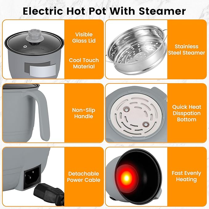 - 【Multi-Function Hot Pot With Steamer】Electric hot pot is versatile for cooking and can be used as a wok,quick cooker and steamer,perfect for steaks,eggs,fried rice,ramen,oatmeal and soups.A stainless steel steamer plate that allows you to cook soup and steam meat at the same time,saving time.Perfect to used as lazy pot,electric pot for cooking dorm,small instant pot for 2 people,shabu shabu pot,ramen pot,pasta cooker