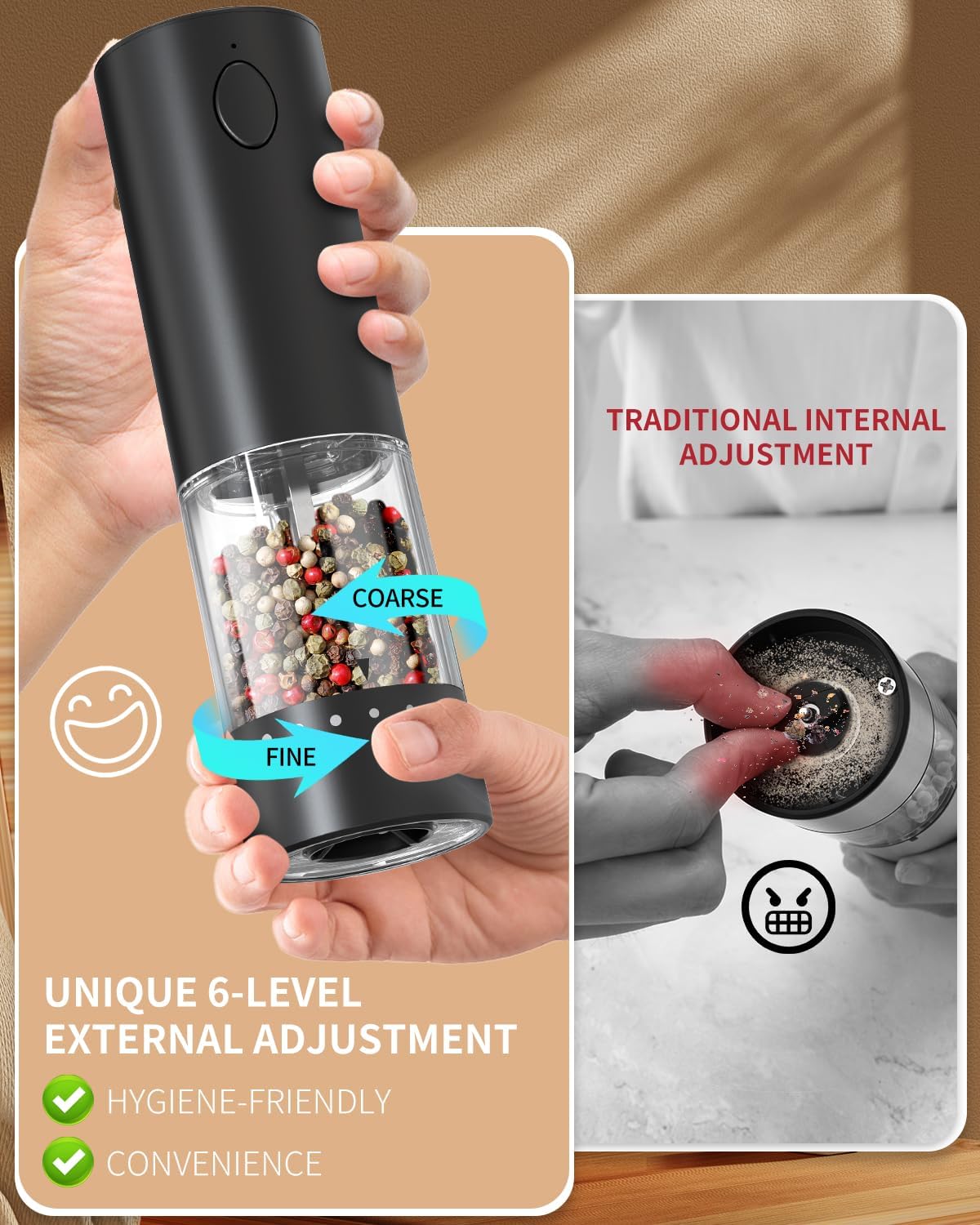 - 【USB-C RECHARGEABLE】Never run out of power mid-cooking again! This electric pepper grinder comes with a USB-C rechargeable battery for quick and easy charging using the included cable. No more disposable batteries—save money and reduce waste with this eco-friendly design