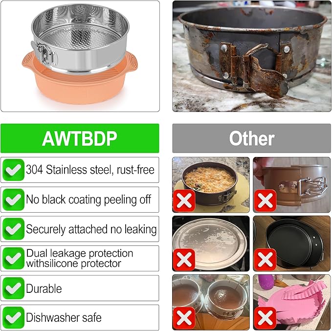 - Better Water Bathing Experience: This springform cake pan, which includes a thick and slightly stretchy silicone pan protector, no need to wrap layers of tin foil and is the perfect solution to prevent water from intruding into the pan when making a cheesecake in a water bath. The silicone pan protector makes grabbing this out of the oven much easier and can prevent unwanted and unfortunate spillage. Enjoy the convenience of silicone pan protective cover while experiencing the joy of preparing delicious meals for family and friends