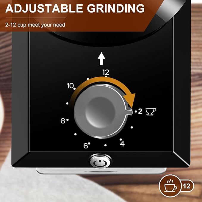 - 【Customizable for 2-12 Cups】This coffee grinder has an on-demand grinding function. According to the amount of coffee grinding you choose, from 2-12 cups, automatically grind the exact amount of coffee grounds for you.