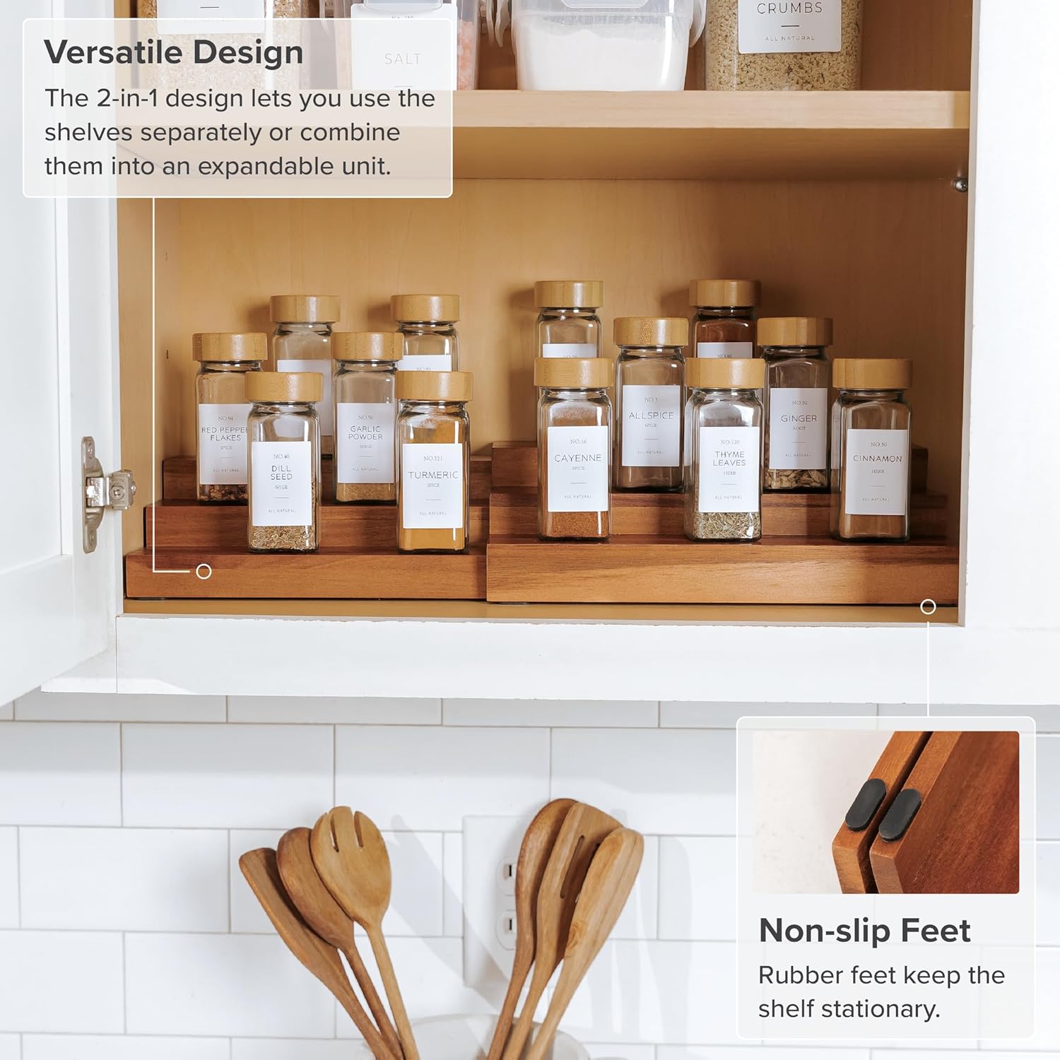 - Stable and Secure: Non-slip rubber feet ensure your acacia spice rack remains steady inside cabinets or on countertops, providing worry-free storage and organization