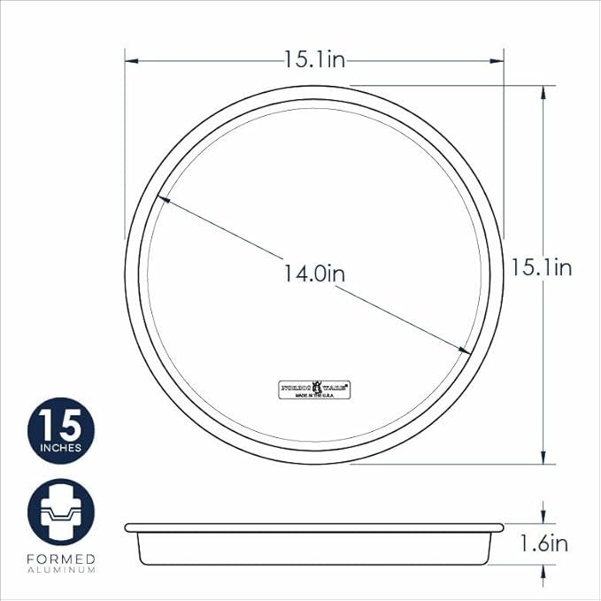 - Pan has a 15.1 inch diameter, with a cooking surface diameter of 14 x 1.6 inches.