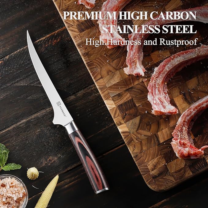 - Premium Material: This boning knife is made from high carbon stainless steel that maintains its functionality for a long time, the boning knife for meat cutting is razor sharp, rust-resistant, durable, tarnish-free and easy to re-sharpen.