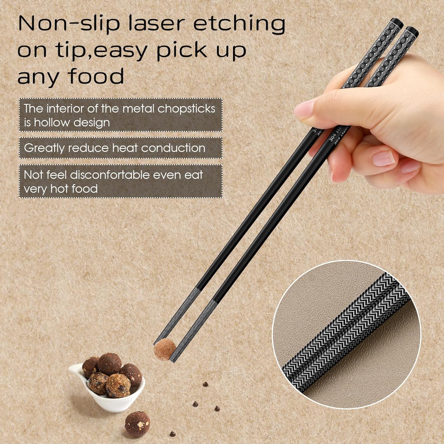 - Tip Laser Etched Non-Slip Marks, Hollow Design Reduces Thermal Conductivity: The tip of the chopsticks has a laser etching mark, which increases the friction of the chopsticks, so as to achieve the purpose of non-slip, which help you easy to pick up any food. The interior of the metal chopsticks is hollow design, which reduces the thermal conductivity of the metal chopsticks, even if it is used to eat very hot food, it will not make you feel discomfortable.