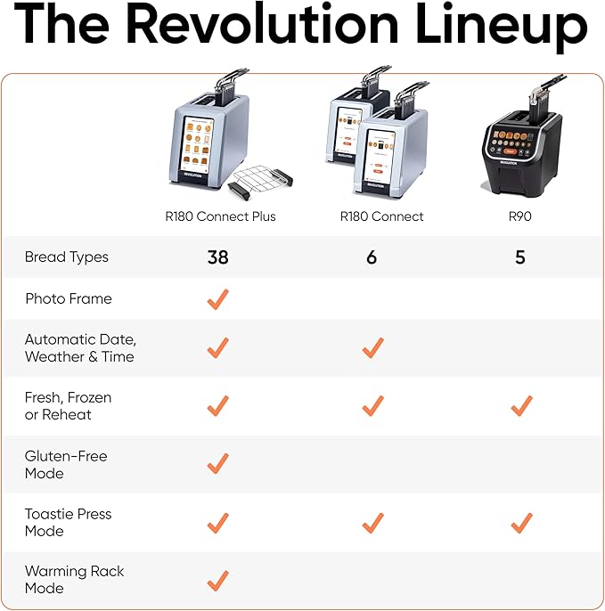 - MORE POSSIBILITIES WITH PLUS – The R180 Connect Plus unlocks toasting algorithms for 38 bread types, including a dedicated Gluten‑Free mode and Warming Rack mode. The built-in digital photo frame displays up to 25 of your favorite images, making it a statement piece even when not in use.