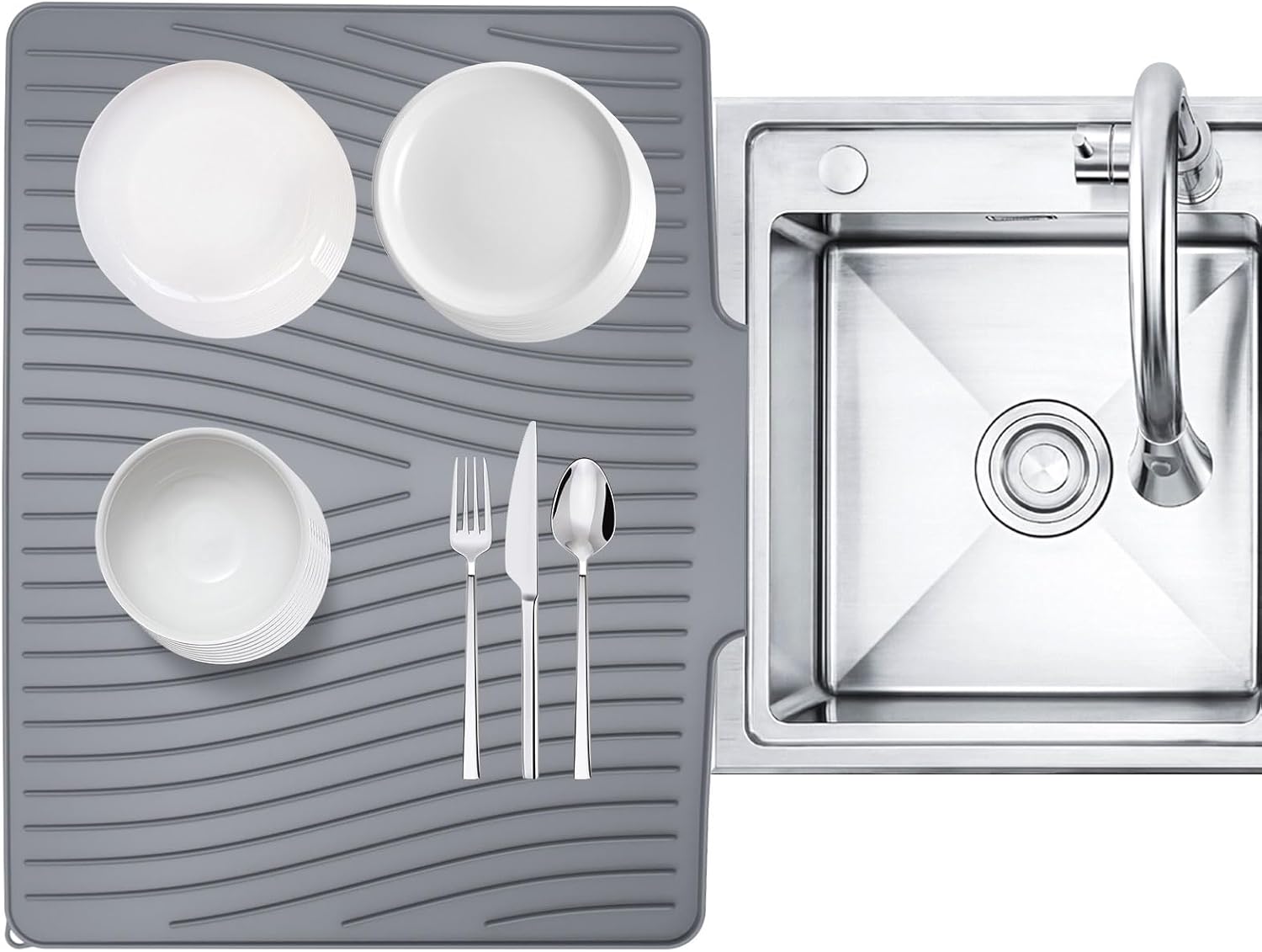 Silicone Dish Drying Mat with Drain Lip 23.6'' x 17.9'' Non-Slip Silicone Dish Drying Mat for Kitchen Counter, Heat Resistant Dish Drying Pad Quick Dry Self-draining Dish Drainer Mat Board Grey