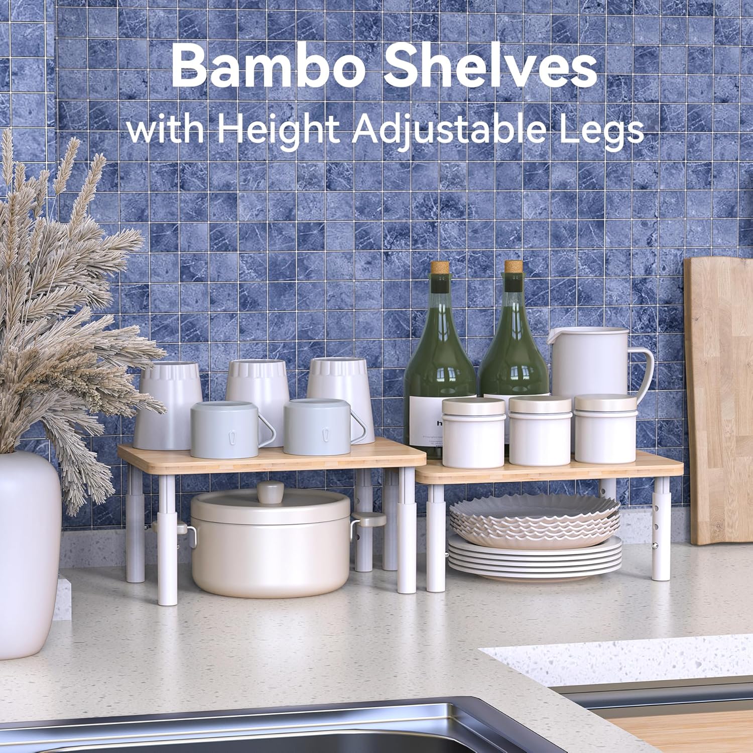 Cabinet Organizer Shelf, Spice Rack Set of 2 Kitchen Pantry Cupboard Shelves, Stackable, Height Adjustable, Natural Bamboo (11.7" Wx77.Dx6.57 H per Pack)