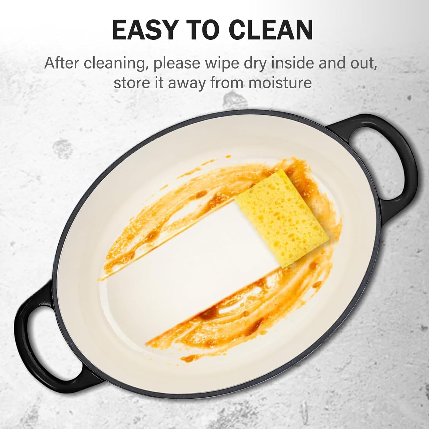 - Oval Dutch Oven Pot with Lid: Enameled cast iron oval dutch oven casserole dish pot with lid is made of cast iron and covered with heavy-duty enamel to avoid chipping. The design of white non-stick enamel interior is engineered to ward off dulling and staining. This oval dutch oven does not need to be seasoned in advance, so it is very suitable for healthy cooking without safety worries