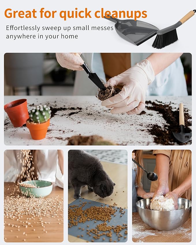 - This all purpose brush and dustpan set is your great household assistant, ideal for cleaning debris from couch, furniture, countertop, it also works effectively on bed sheet, car interior or any surface that needs a helping hand.