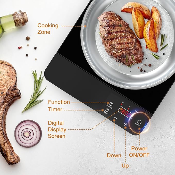 - Multi-function Induction Cooktop:Electric cooktop single burner has 8 power levels and 8 temperature (176℉-1112℉) settings, from heating milk to stir fry, there is no pressure on the stove.LED sensor touch control, you can easily adjust temperature, power, cooking mode, child lock or set timer. The black microcrystalline stone top is scratch, abrasion and heat resistant, and also easy to clean.