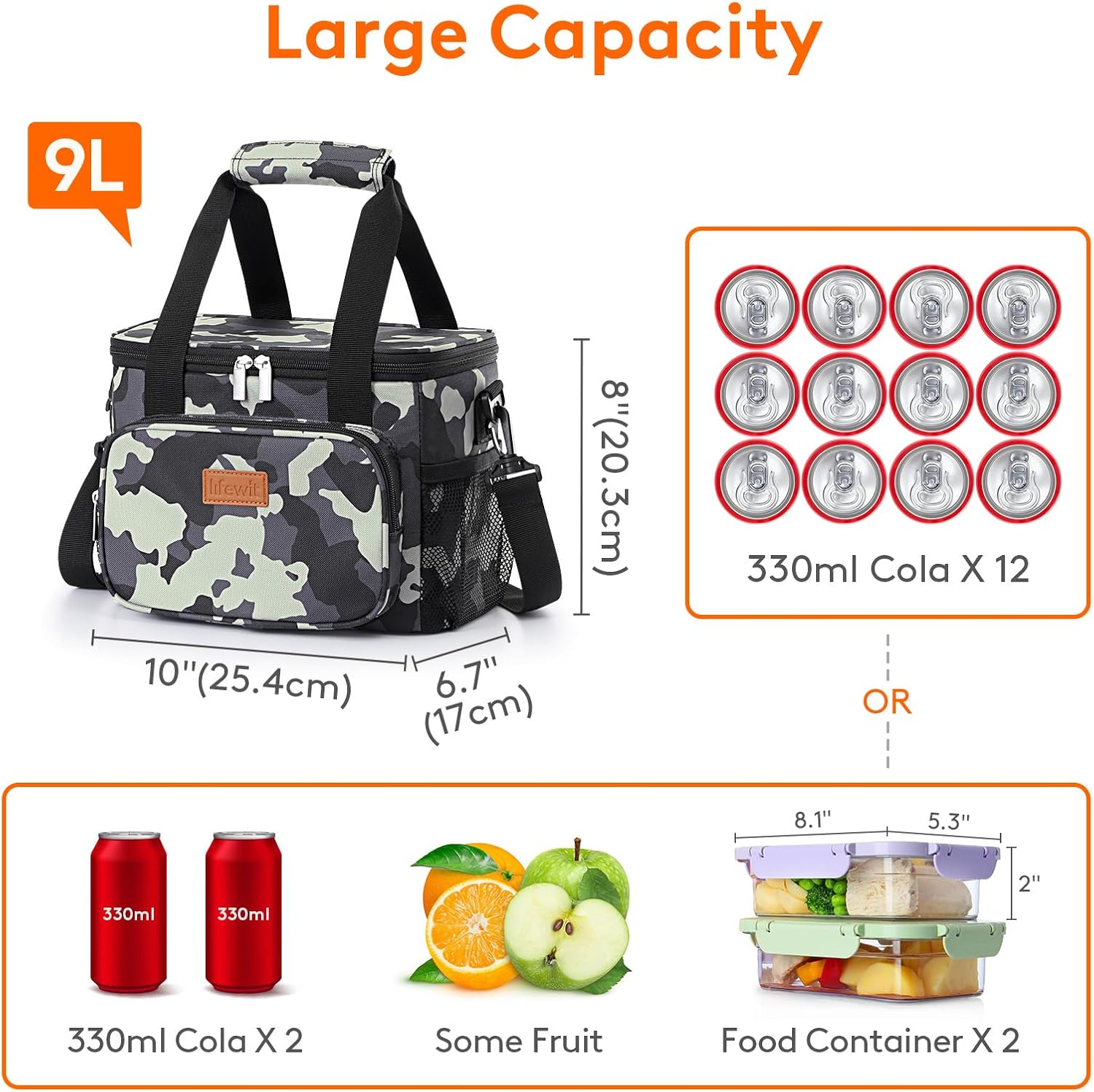 - Large Capacity: Dimensions - 10" ( 25.4cm ) ร 6.7" ( 17cm ) ร 8" ( 20.3cm ). The maximum capacity of lunchbox for adults is 9L, and is spacious enough to store 12 cans of coke (330ml), or your lunch such as sandwiches, salad, snacks, drinks and fruits and so on. It is suitable for office, for work, picnic, beach, trip.