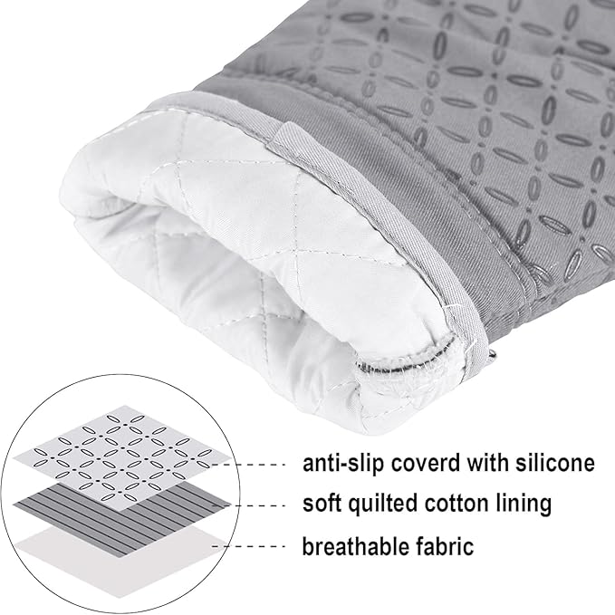 - 500°F HEAT RESISTANT &NON-SLIP: This oven mitts heat resistant 500 degrees because of the durable construction so it can effectively keep you protected from burning while you enjoy cooking and grilling. Enhanced with anti-slip silicone design to provide a more robust, non-slip grip that can be held securely when handling the kitchen utensils