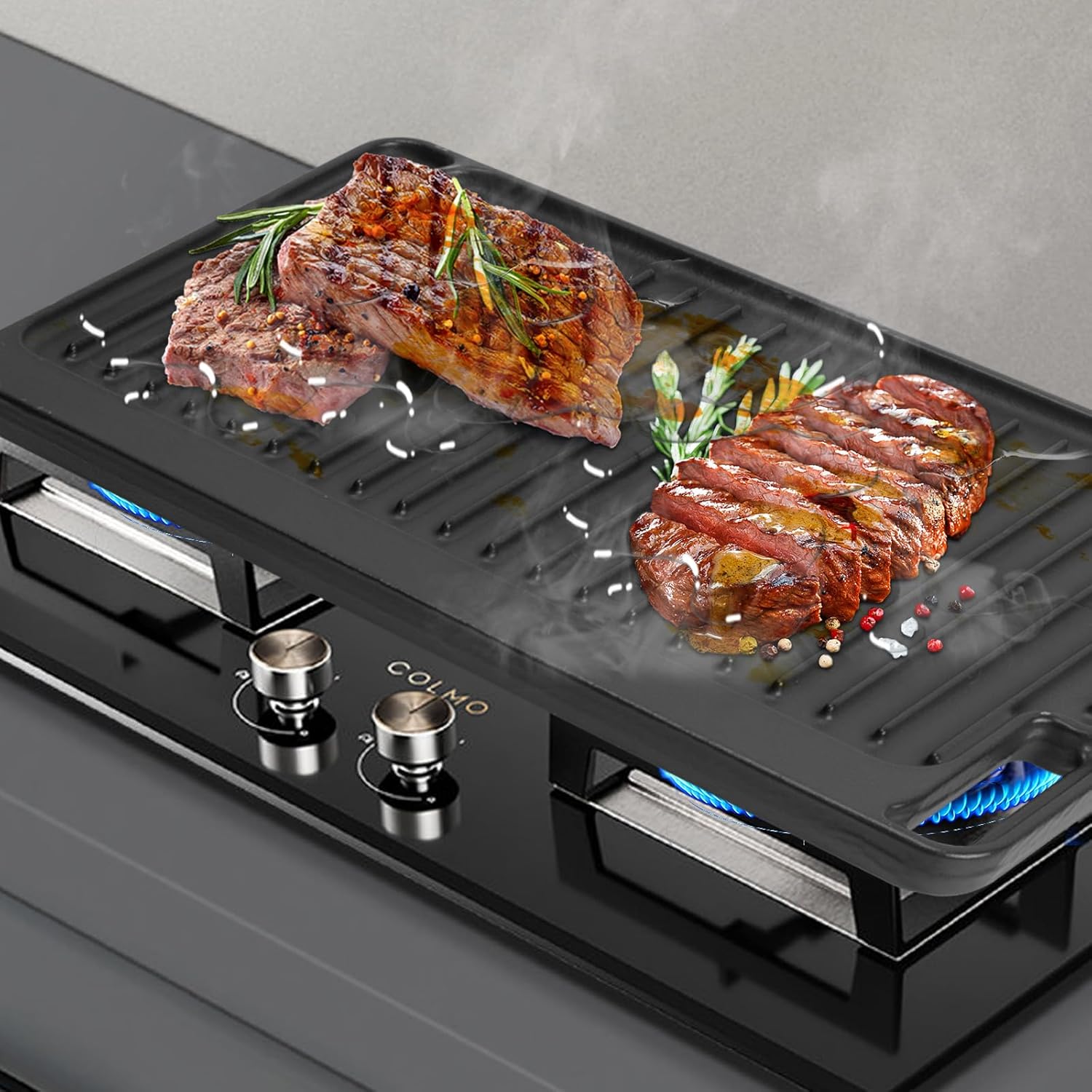 - MULTIFUNCTIONAL: Suitable for most stovetops, gas grills, ovens, etc., the reversible design allows it to be utilized on both sides, the flat side is perfect for cooking eggs, veggies, pancakes, etc., and the fluted side is perfect for steaks, bacon, and other kinds of meats. Perfect flat top griddle pan meets your multiple cooking needs, a necessity in your kitchen!