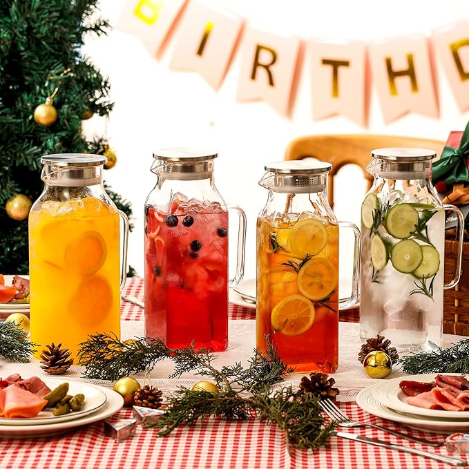 - Large Capacity: The square glass pitcher boasts a substantial 68oz (2-liter/0.53 gallon) capacity, holding approximately 18 cups of your favorite juice. Perfect for serving large gatherings or for keeping your family hydrated throughout the day!