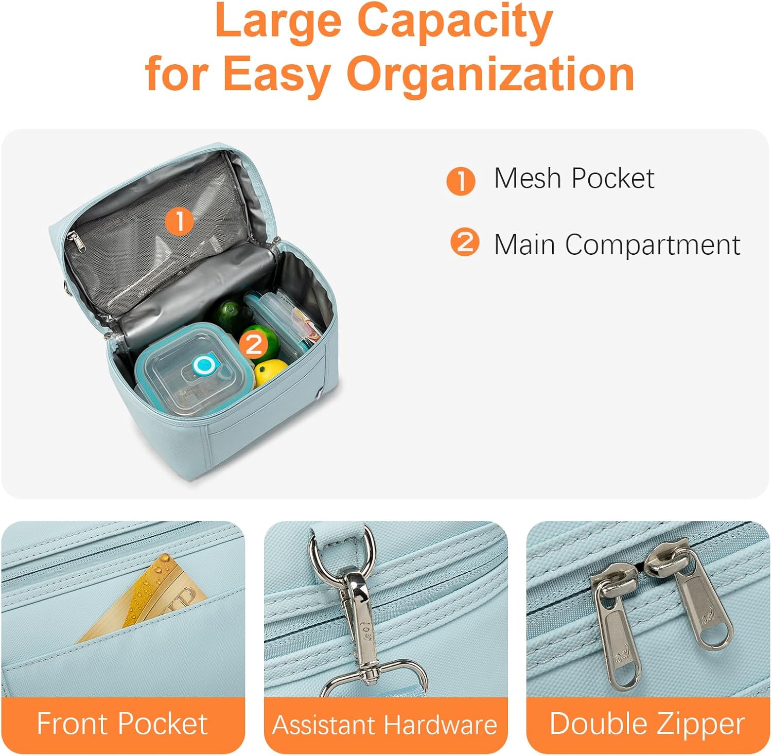 - Construction & Pockets: 1 main compartment with zipper closure(double zips in YKK), 1 interior zip mesh pocket can fit paper napkin, handkerchief, keys, or cellphone. Outside 1 insert pocket in the front of the bag for small essentials.Our lunch bags for women/men is spacious enough to fit your lunch box, snacks, and drinks and prefect to take foods and snacks with your outdoor activities.