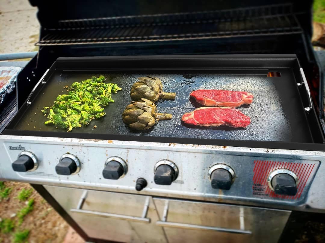 - 【Features】The inserts griddle is closer to the fire source and heats up more easily than other griddles placed on the grates to achieve the temperature needed to cook delicious food. Before use, please remove the grate & emitter plates to achieve closer to the heat source. The surface of the baking pan is made of coating, durable and easy to clean, need to be heated and oiled 1-2 times before use for better results.