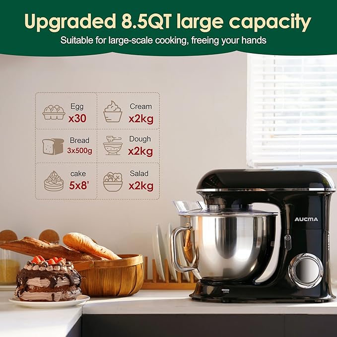 Aucma Stand Mixer,8.5QT 900W Tilt-Head, Large Capacity Kitchen Electric Mixer with Dough Hook, Wire Whip & Beater (Black, 8.5QT)
