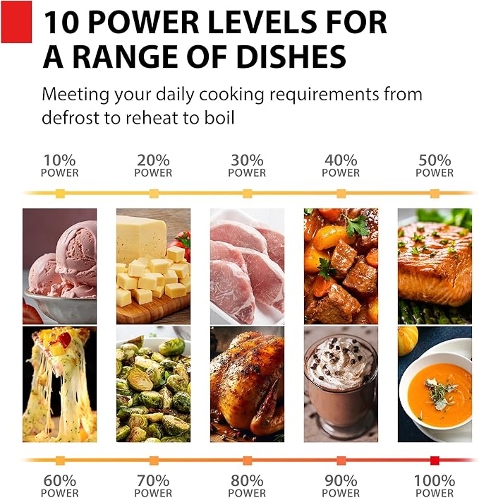 - 10 Power Levels: Perfect for everything from defrosting to boiling liquids to preparing full meals, 10 power cooking power levels offer great versatility for all of your culinary needs.