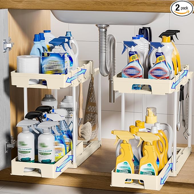 Delamu Under Sink Organizers and Storage, 2 Pack Pull Out Kitchen Bathroom Cabinet Organizer, 2 Tier Beige Under Sink Storage for Bathroom Kitchen