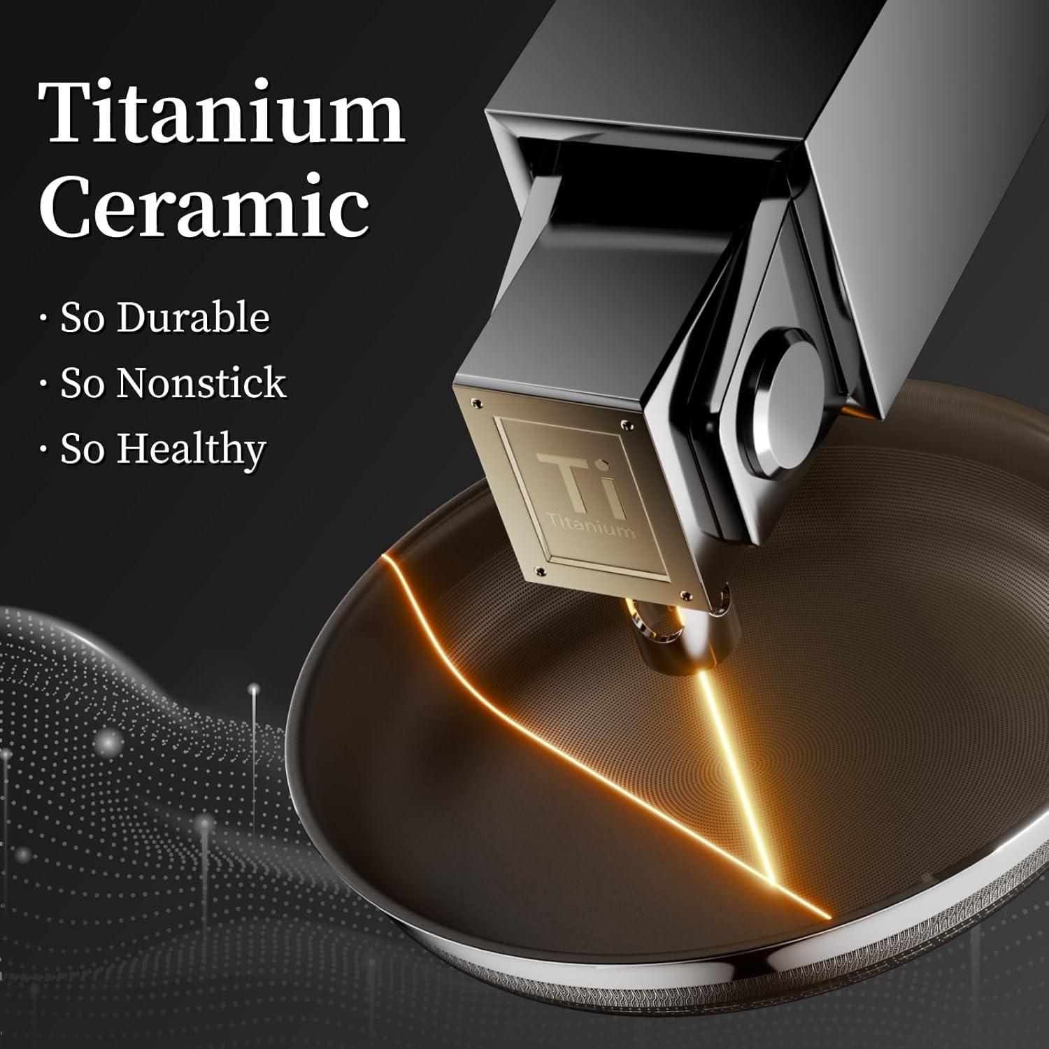 - 【HEALTHY & SAFE】Titanium ceramic non-stick cookware has a titanium alloy protective layer on the surface, which is non-toxic and harmless, and our pans are 100% free of harmful substances such as PFOS, PFOA, and PTFE, which ensures your daily cooking is healthier and safer.