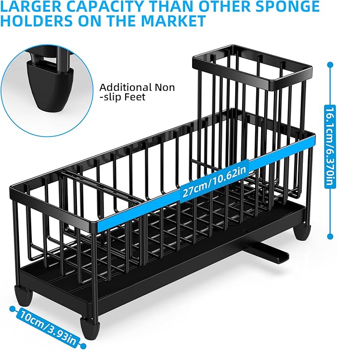 - 【LENGTH UPGRADE LONGER VERSION】Moforoco Lengthen sponge holder has increased the length by 1.37 inches compared to the regular 9.25-inch length on the market, and the total length is 10.62 inches. It means you can accommodate 2 * soap dispenser bottles, 4* brushes, and a sponge, making your storage space easier, accommodating more of your items and saying goodbye to clutter.