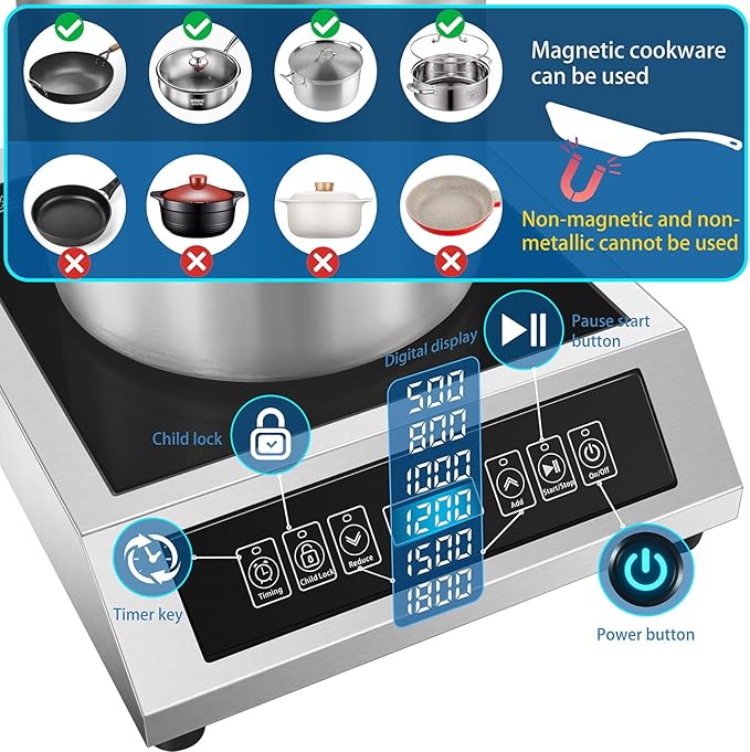 - Selection Of Pots And Pans: the principle of our machine is electromagnetic induction heating, pots and pans must be magnetic, the bottom of the pots and pans are flat, not suitable for aluminum pots and pans, ceramics, glass and other pots and pans without magnetism