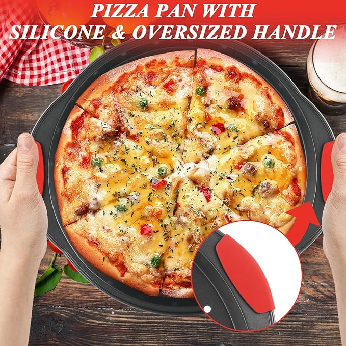 - Superior Material: Made of heavy duty food-grade carbon steel, Pizza Pan Plates are BPA-free, featuring silicone handles that is convenient to carry and transport without injury.