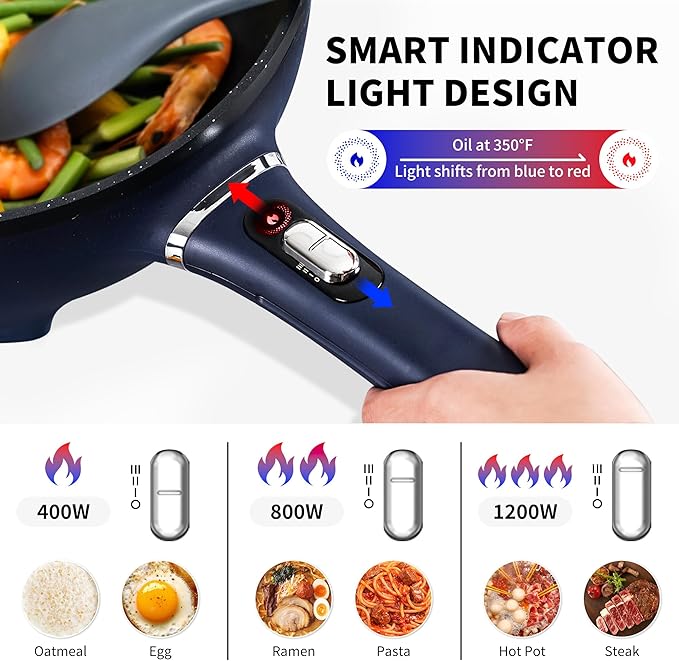 - 【Powerful Heating with Adjustable Settings】Autucu T1SNA features a 1200W power system with 400W, 800W, and 1200W settings, this electric pot accommodates a variety of cooking needs. The handle’s built-in indicator light changes from blue to red, signaling an oil temperature of around 180°C—the ideal time to start cooking for enhanced flavor, better nutrition, and reduced smoke.