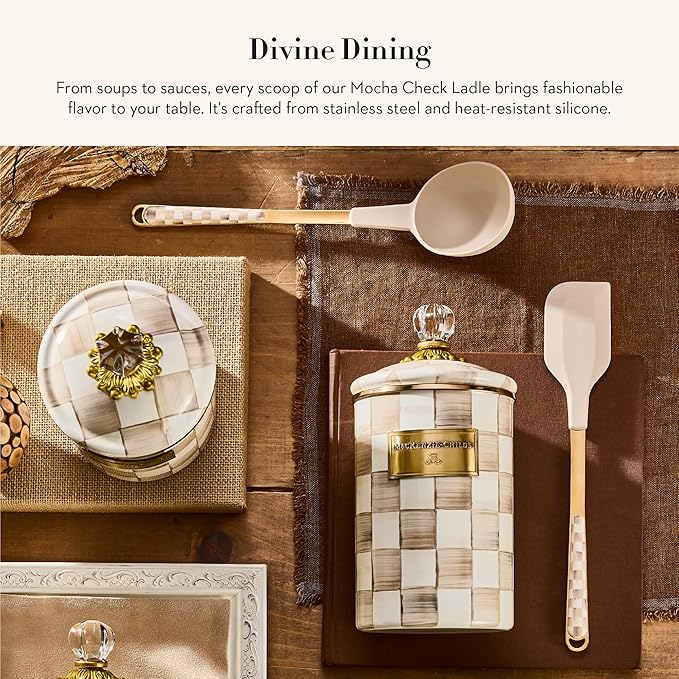 - ELEGANT SERVING ESSENTIAL: This cute serving ladle features our charming brown-and-white Mocha Check pattern. It is crafted with a stainless-steel handle and a heat-resistant silicone top and is a chef-worthy serving tool.