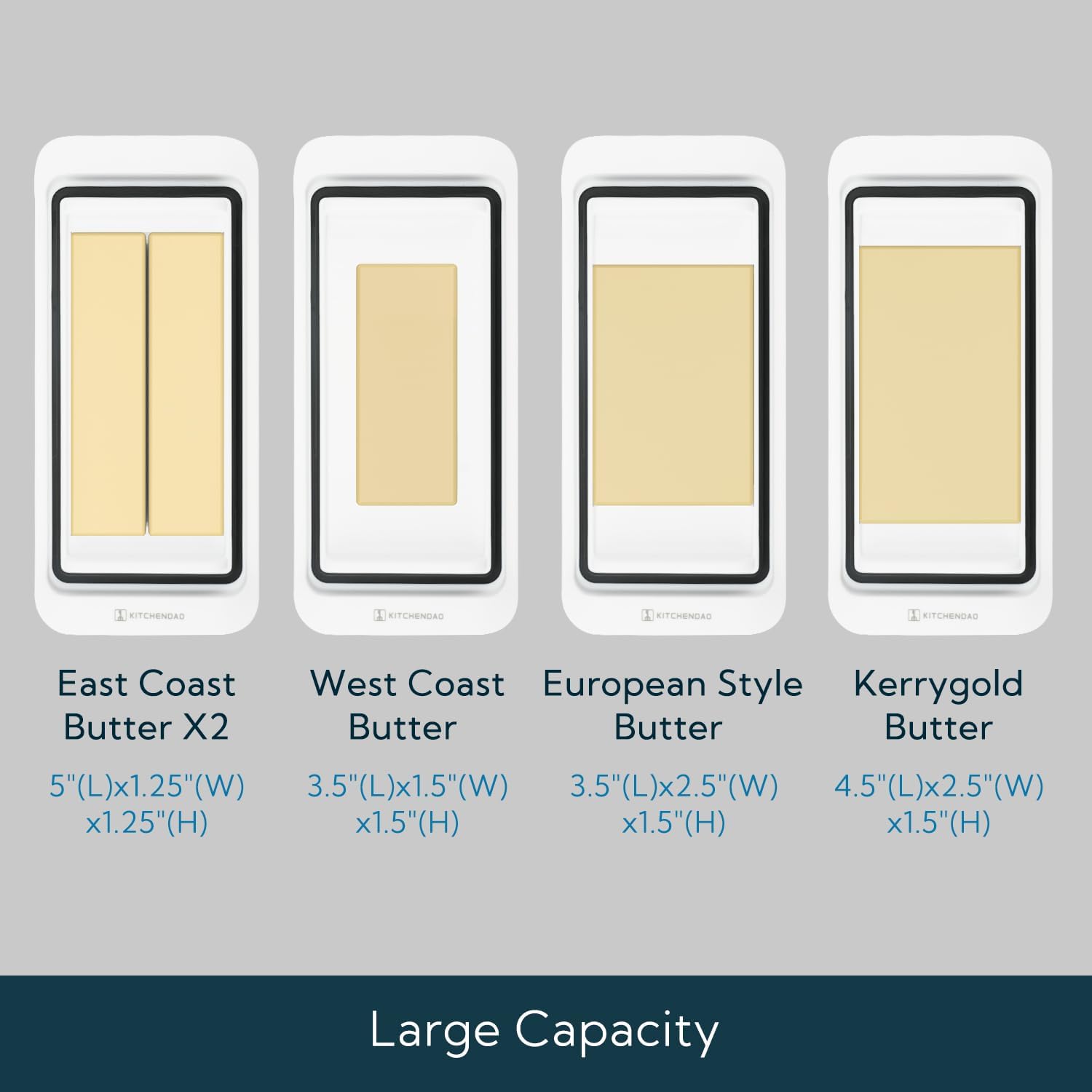 - Large Capacity: The large butter dish with cover is suitable for Eastern, Western, European style and Kerrygold butter, cream cheese. The butter keeper can hold up to 2 sticks of eastern butter