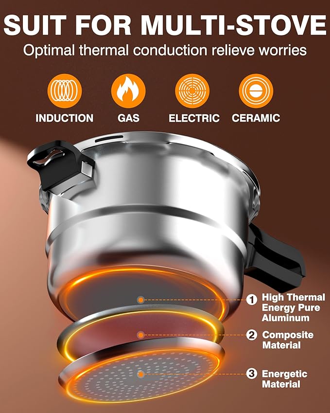 - VERSATILE COOKING OPTIONS: Compatible with both gas and induction stoves, this pressure pot cooker allows you to steam, braise, and simmer with even heat distribution. Perfect for cooking beans, meats, seafood, vegetables, and soups, it locks in nutrients for delicious, healthy meals.