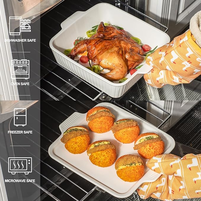 - HIGH-QUALITY MATERIAL: Crafted from durable ceramic and fired at high temperatures, this ceramic baking pan can withstand both high and low temperatures. It’s safe for use in the refrigerator, microwave, and oven, making heating food a breeze. The robust design ensures it won’t easily break, providing long-lasting use.