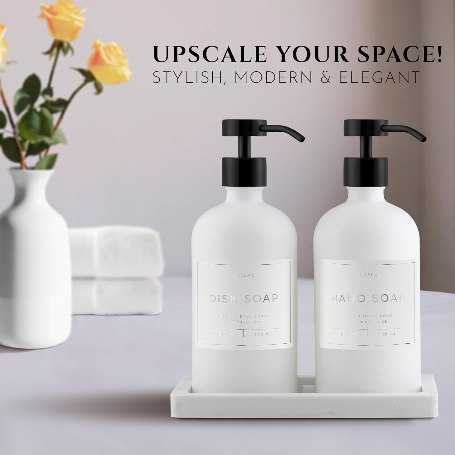 - THIS COMPLETE SET INCLUDES 2 16.8 Oz Boston round white matte glass bottles, 2 black matte wide tops stainless steel pumps, marble silicone tray, and 15 waterproof labels (HAND SOAP, DISH SOAP, FACE WASH, SANITIZER, LOTION in white, black, gray color and silver lettering), ready for immediate use.