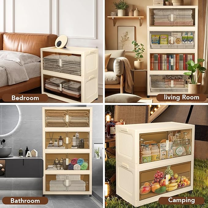- 【Stackable & Easy Installation】The collapsible storage box with Doors is a new storage organizer with a stackable design that can be folded away on all sides when not in use, transforming the storage cube into a flat panel for easy storage under the bed or trunk.