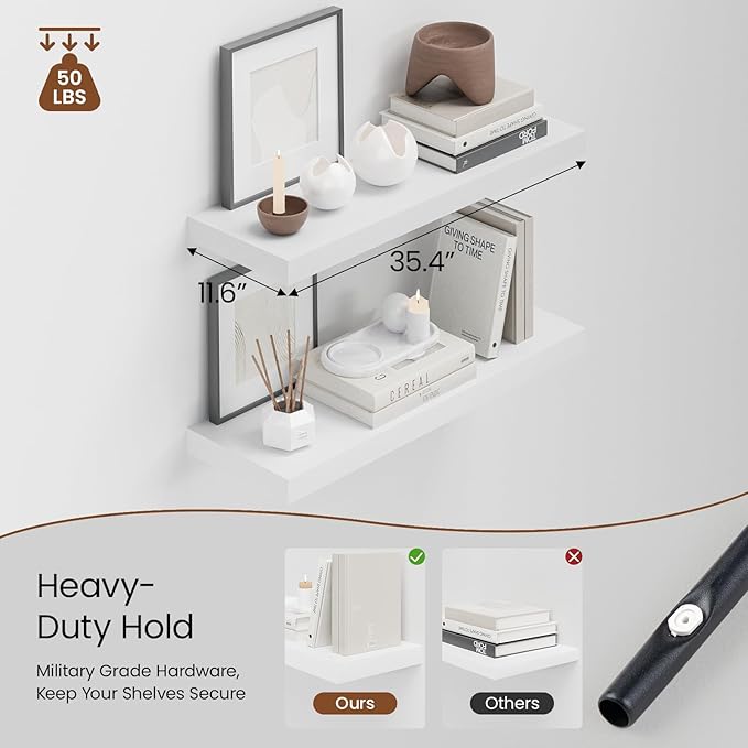 - Extra Deep Floating Shelves: Measuring 11.6” D x 35.4” W x 1.5” H, these shelves are crafted for maximum depth and durability. The spacious 12” depth gives you plenty of room for stylish display, organized storage, and decorative accents. Perfectly suited for your bathroom, kitchen, or living room, they enhance both function and flair in any space!