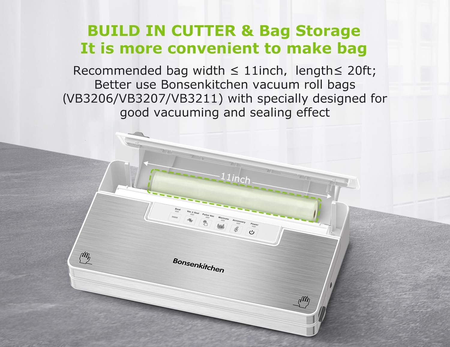 - BUILT-IN CUTTER & STORAGE: Features a 13.43-inch built-in cutter to custom-size bags effortlessly. The large roll compartment holds 11in x 20ft bags (included) and saves counter space. Pro Tip: For best results, use Bonsenkitchen’s deep-groove bags for airtight seals every time