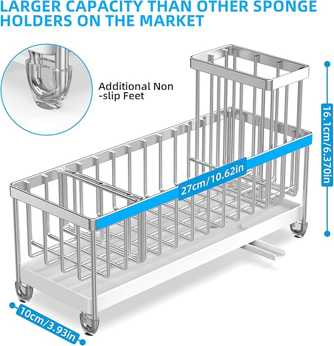 - 【LENGTH UPGRADE LONGER VERSION】Moforoco Lengthen sponge holder has increased the length by 1.37 inches compared to the regular 9.25-inch length on the market, and the total length is 10.62 inches. It means you can accommodate 2 * soap dispenser bottles, 4* brushes, and a sponge, making your storage space easier, accommodating more of your items and saying goodbye to clutter.