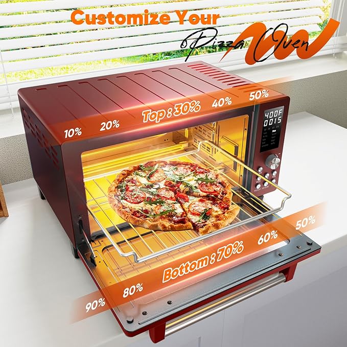 - CUSTOMIZE YOUR PIZZA OVEN - Adjust the ratio of top and bottom heaters from 0 to 100% and convection fan speed for different types of heating zones. To bake a perfect thick pizza, set bottom heaters at 70% power & top heaters at 30% for crispy perfectly melted cheesy toppings and crunchy crust.