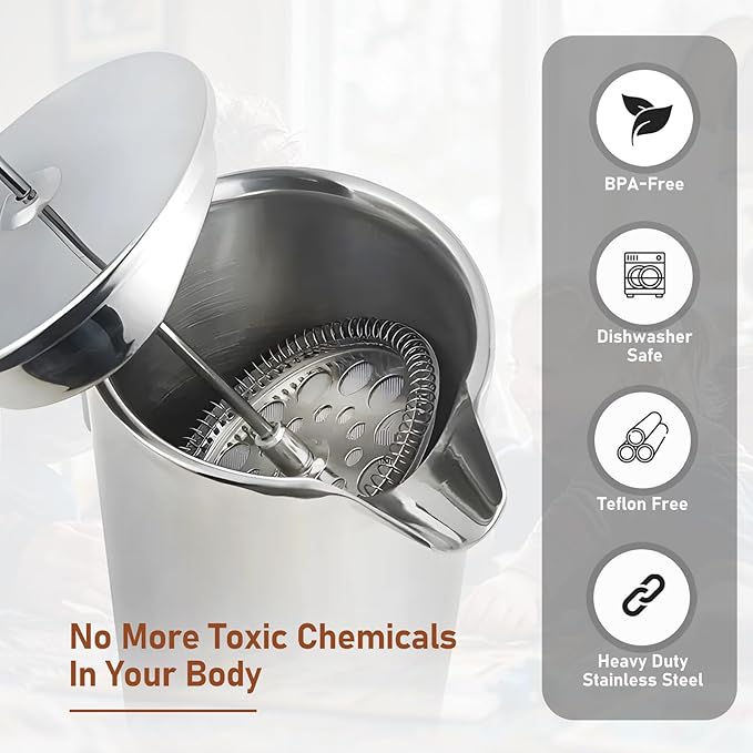 - Premium 304 Stainless Steel Inserts Construction:Crafted from high-quality 304 stainless steel, this French press is built to last. Unlike glass or plastic models, it resists rust, corrosion, and breakage, ensuring long-term durability. Perfect for daily use at home, in the office, or even during outdoor adventures like camping.