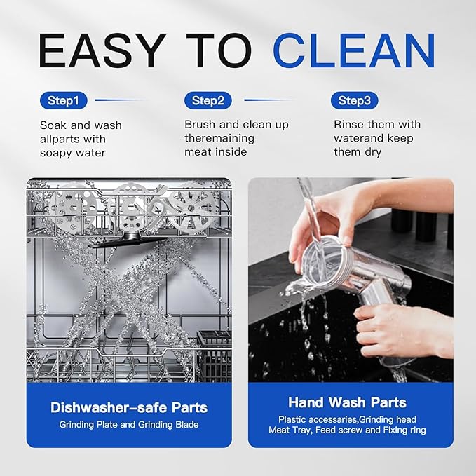 - 【EASY TO CLEAN & STORAGE】 This electric sausage stuffer is easy to remove and clean, with accessories such as stainless steel blades and grinder plates that can be put in the dishwasher or hand washed. It is also equipped with an ABS plastic case to store the accessories or fill it with grated meat and other ingredients.Attention: Meat grinders, trays, and meat grinders cannot enter the dishwasher