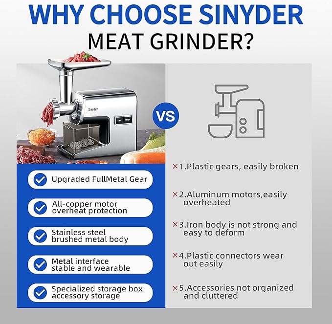 - 【POWERFUL MEAT GRINDER】 Sinyder meat grinder electric is a powerful force in your kitchen, where the 100% pure copper motor has Max output of 3,000 watts and a rated power of 700 watts, easily grinding up to 2 pounds of meat per minute! Plus the built-in metal gears make using the machine more durable! Whether you're a meat lover or a vegetarian, it's a fast, convenient, and economical way to make ingredients at home, a reliable helper!