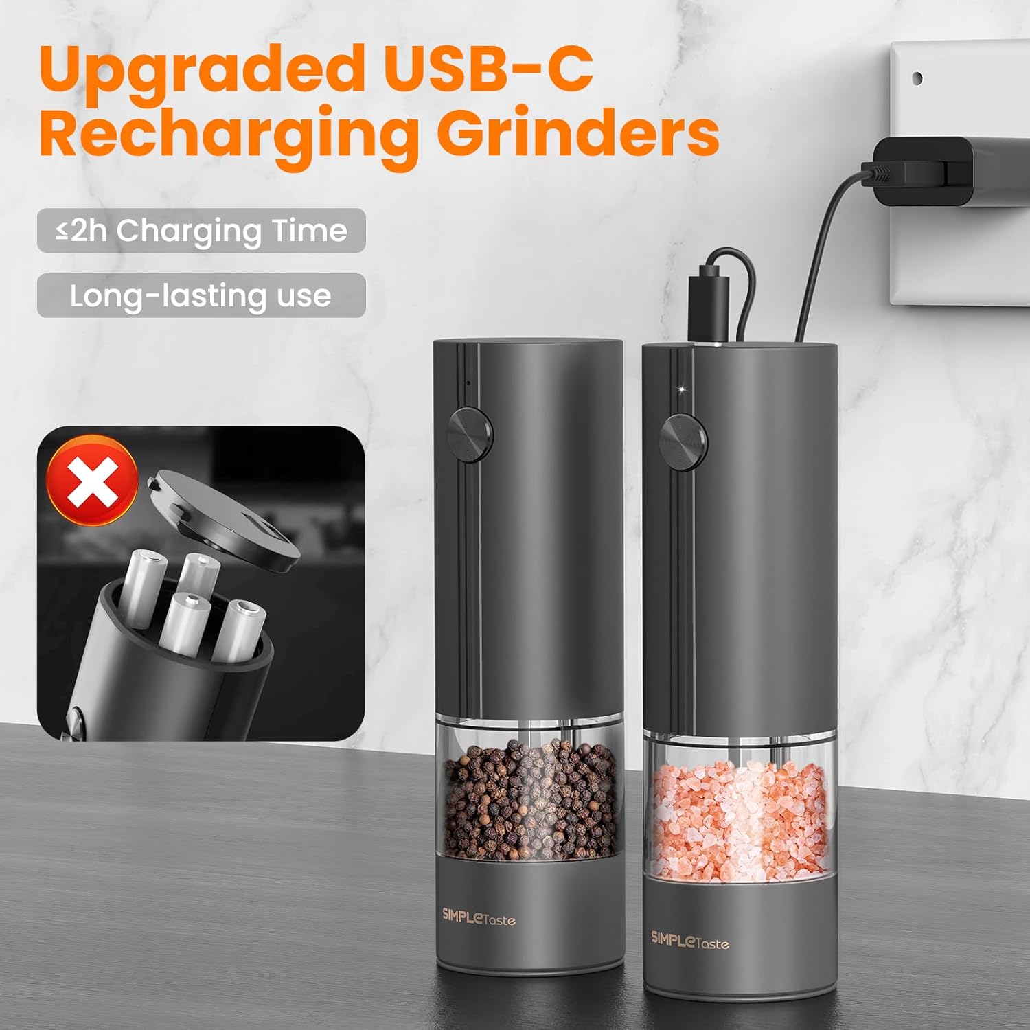 - Long-Lasting Battery: Each SIMPLETASTE Electric Salt and Pepper Grinder features a Type-C charging port and a built-in 300mAh lithium battery, delivering over 15 minutes of continuous grinding on a single charge. Recharge fully in under 2 hours, ensuring your grinders are always ready for action.