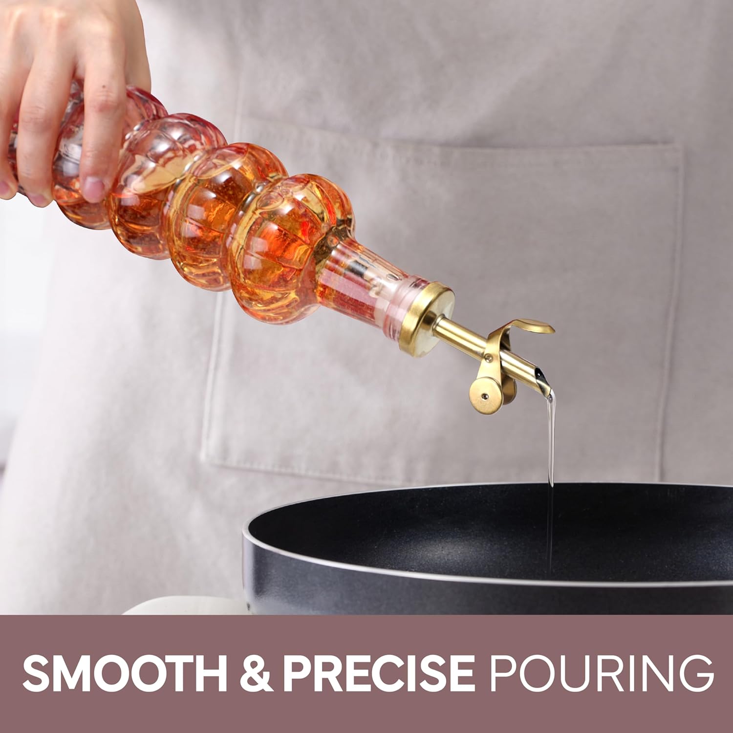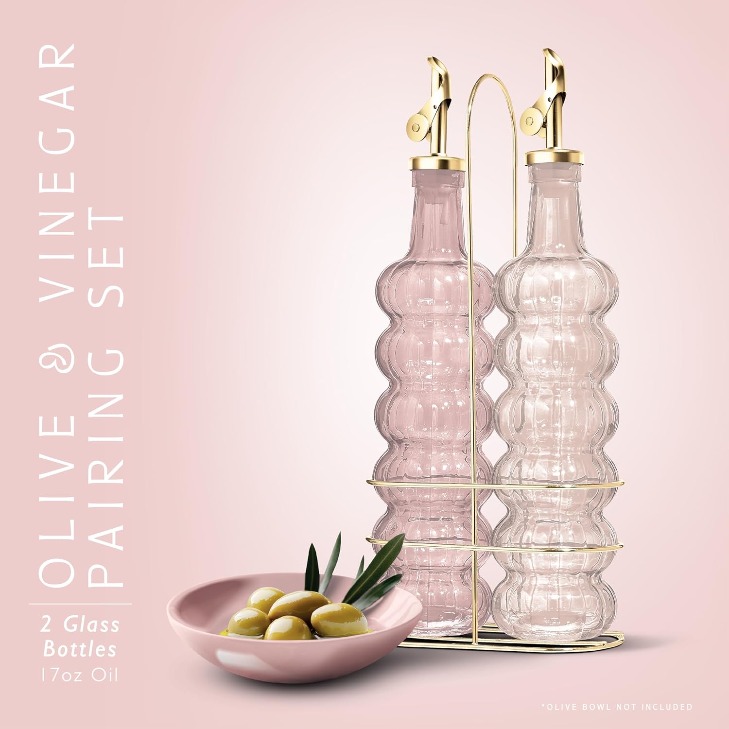- Beautiful and Functional - Our colored glass oil dispensing bottles, with elegeant colors, gold tops and gold wire rack, will elevate your kitchen. Don't use just any oil bottle, upgrade the way you cook. That's our mission.