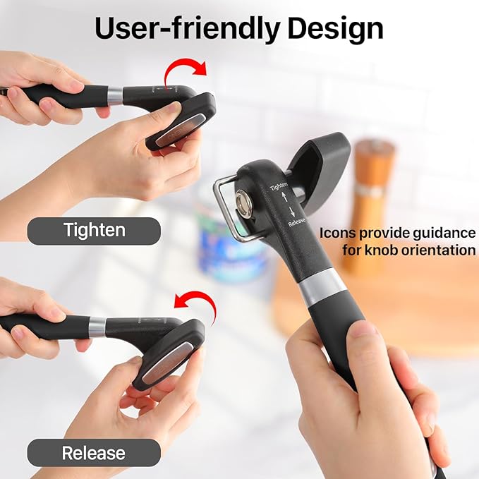 - User-friendly Design and Easy to Use: For better opening cans, we have added a simple direction marking on the top of the can opener, it will let you know cleanly which direction the knob controls the blade to tighten and loosen when opening the can, a great kitchen tools for children trying to get involved in kitchen activities and the elderly