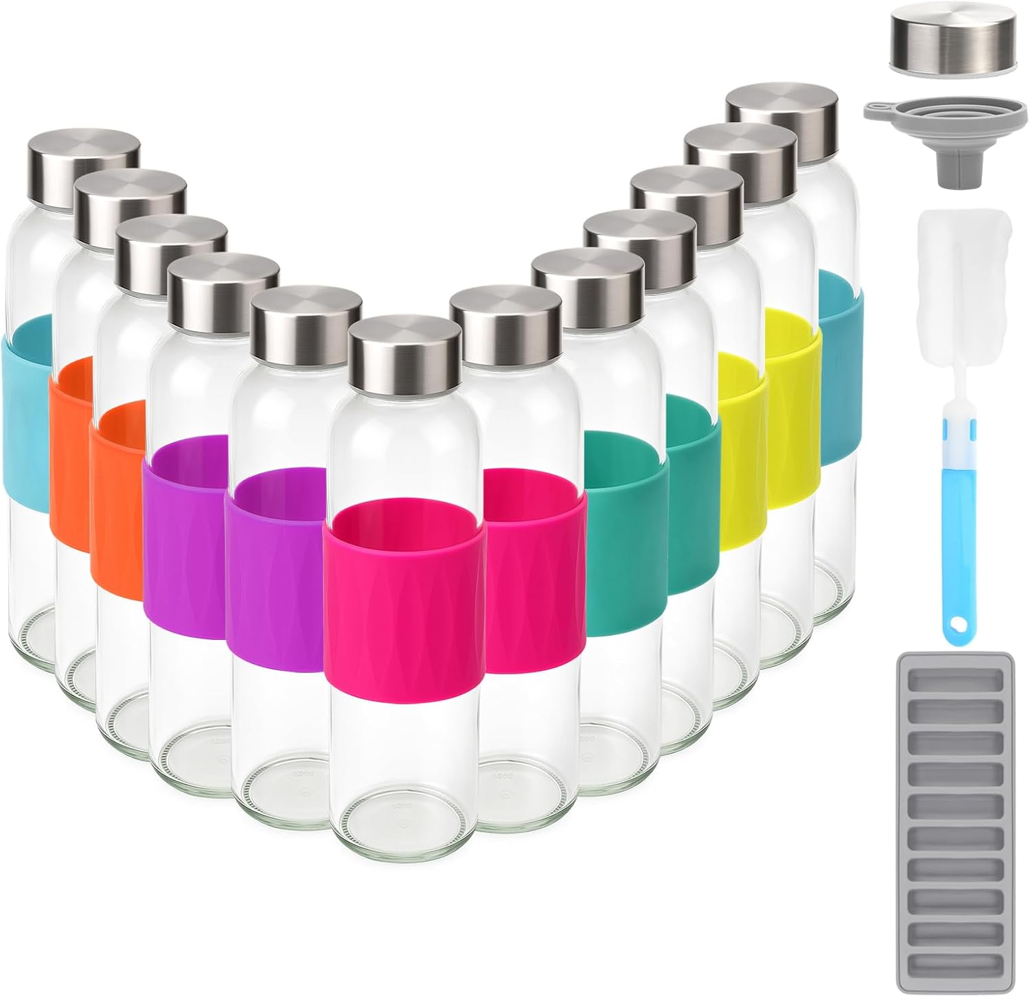 - SAVE MONEY WITH THIS VALUE PACK: Juicing Kit Bundle includes : 12 pack clear 18 oz Zukro glass juice bottles with airtight lids, a bottle cleaning brush for easy hand washing, a funnel helps you pour liquids inside the glass containers, an ice tray makes long and narrow ice cubes for adding ice easily, extra 1pc stainless steel airtight lids to ensure that the reusable glass bottles always remain sealed. Get our juicing bottles in bulk packs as gift for your whole family and friends