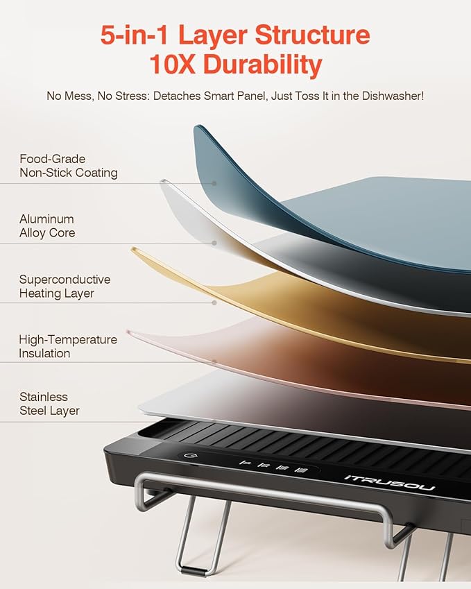 - 5-Layer Construction & 10x More Durable: Constructed with a 5-layer composite structure, including high-conductivity aluminum alloy, super-conductive heating layers, and high-temperature-resistant insulation, this grill is durable, resistant to warping, and capable of withstanding high-frequency, high-temperature use – making it a trusted long-term kitchen companion.