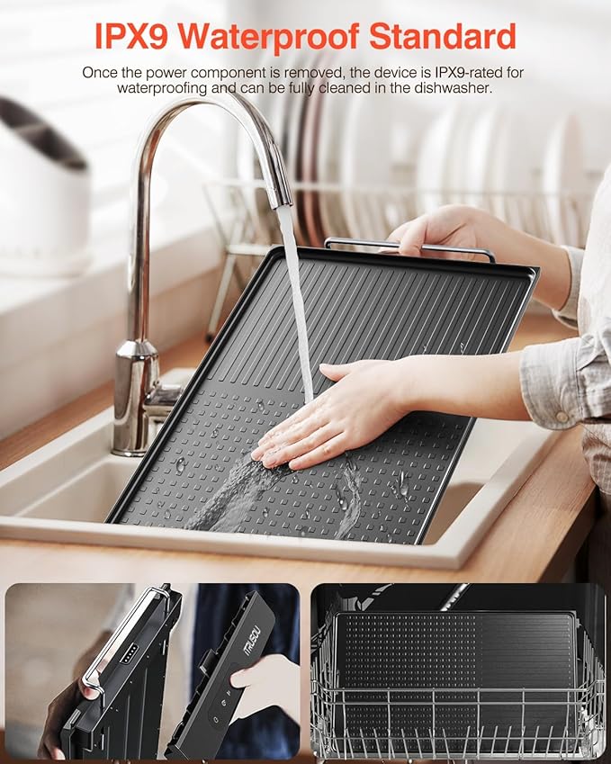 - IPX9 Waterproof & Dishwasher-Safe: Featuring an IPX9 waterproof rating, this unit can withstand high-pressure water jet cleaning. The touch panel is easily detachable, and the entire heating grill plate can be placed in the dishwasher for thorough cleaning, eliminating the need for hand washing – perfect for a fast-paced modern kitchen.